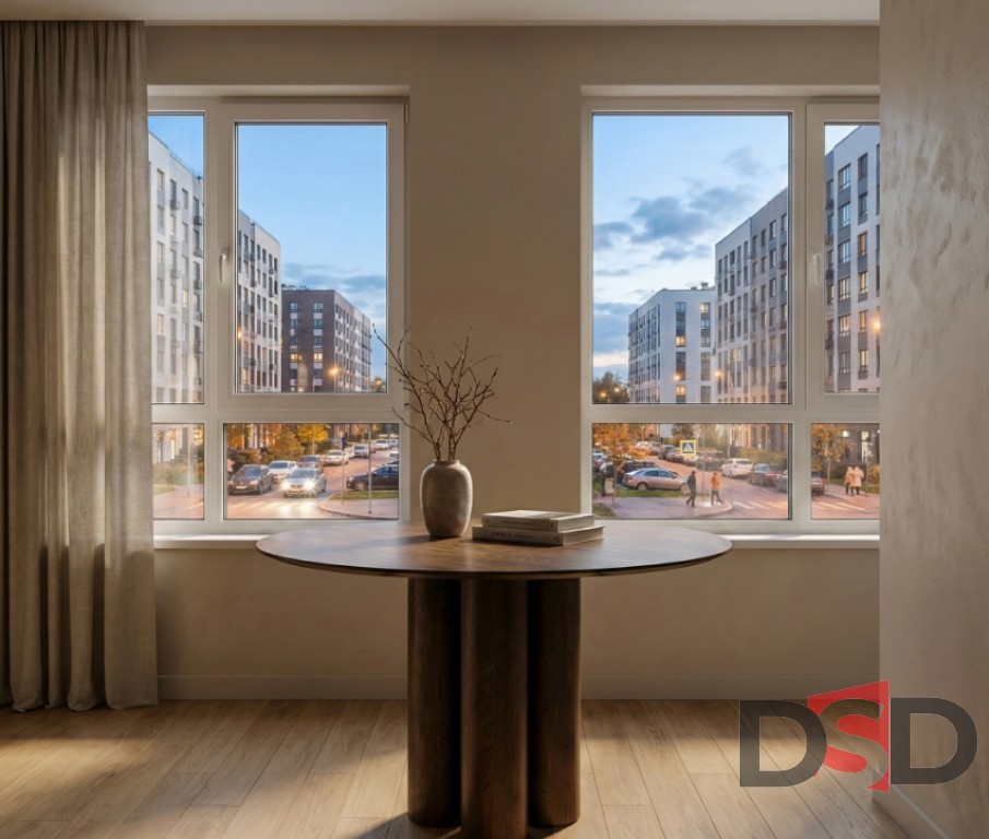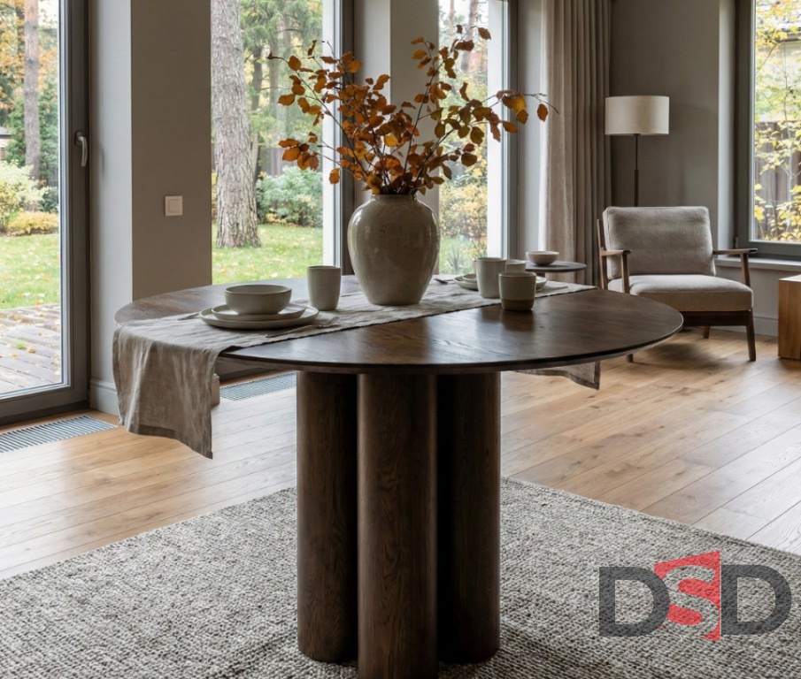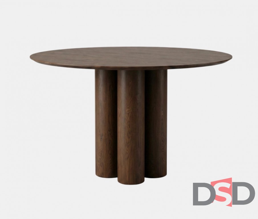 Стол из массива с выразительной текстурой древесины и основанием из трёх цилиндрических опор, подходящий для жилых и коммерческих пространств