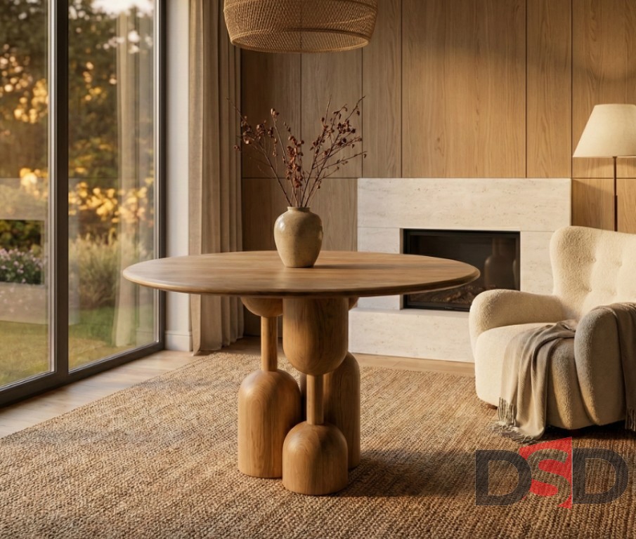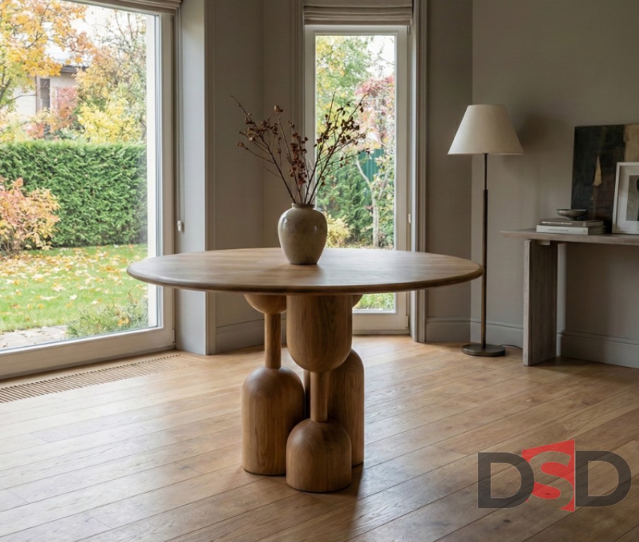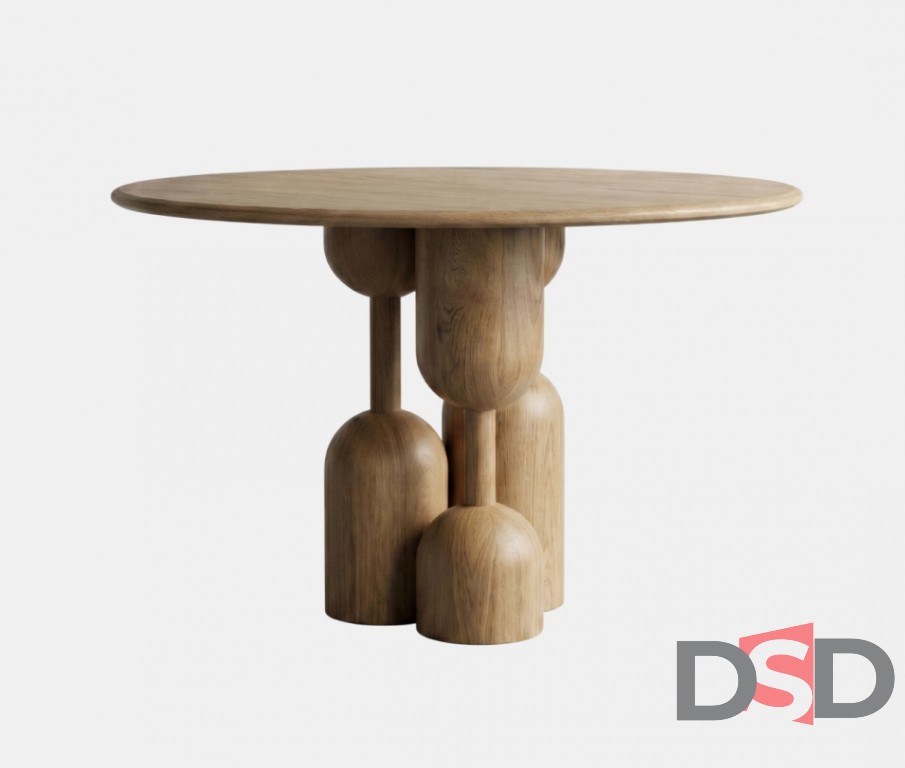 Стол из натурального дерева с пластичным скульптурным основанием, создающий выразительный акцент в жилых и общественных интерьерах